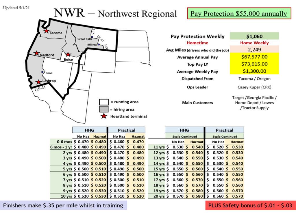 “The job we’re talking about today is a regional route delivering dry van, general commodity freight to big box stores within North-Western United States. All D&H, no touch freight. You’ll be home weekly. Running an average of 2,250 miles per week. Average weekly pay will be $1,300 with a guarantee of $1,060. Top earners are getting over $1,400 per week.”