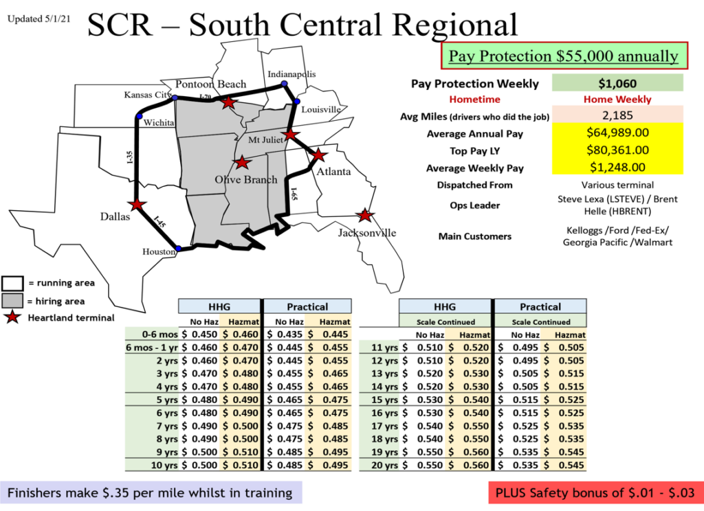 “The job we’re talking about today is a regional route delivering dry van, general commodity freight to big box stores within the South Central United States. All D&H, no touch freight. You’ll be home weekly. Running an average of 2,185 miles per week. Average weekly pay will be $1,248 with a guarantee of $1,060. Top earners are getting over $1,500 per week.”