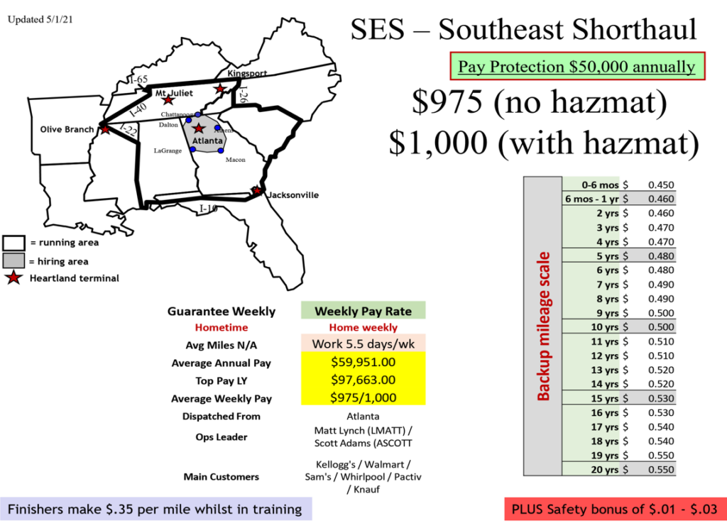 “The job we’re talking about today is a regional route delivering dry van, general commodity freight to big box stores within the Southeast Region of the United States. All D&H, no touch freight. You’ll be home weekly, doing a 5.5 day work week. Average weekly pay will be $1,152 with a guarantee of $975 as long as you’re available for work 5.5 days a week.”