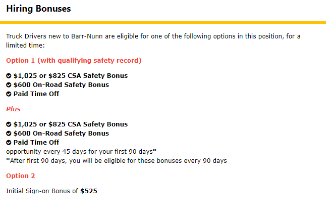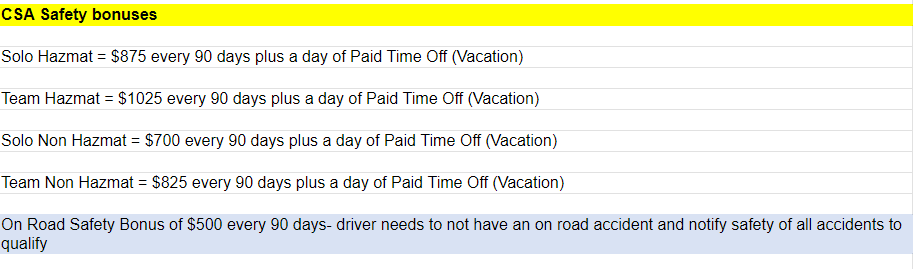 -Solo Hazmat = $875 every 90 days plus a day of Paid Time Off (Vacation) -Team Hazmat = $1025 every 90 days plus a day of Paid Time Off (Vacation) -Solo Non Hazmat = $700 every 90 days plus a day of Paid Time Off (Vacation) -Team Non Hazmat = $825 every 90 days plus a day of Paid Time Off (Vacation) -On Road Safety Bonus of $500 every 90 days- driver needs to not have an on road accident and notify safety of all accidents to qualify |