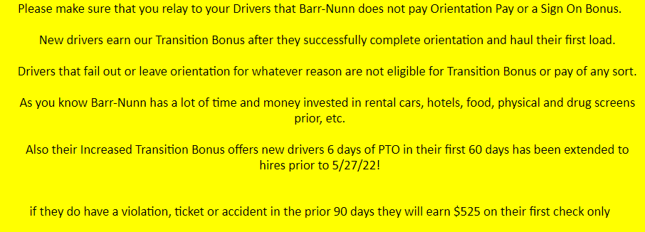 If the driver has a violation, ticket or accident in the prior 90 days they will earn $525 on their first check only