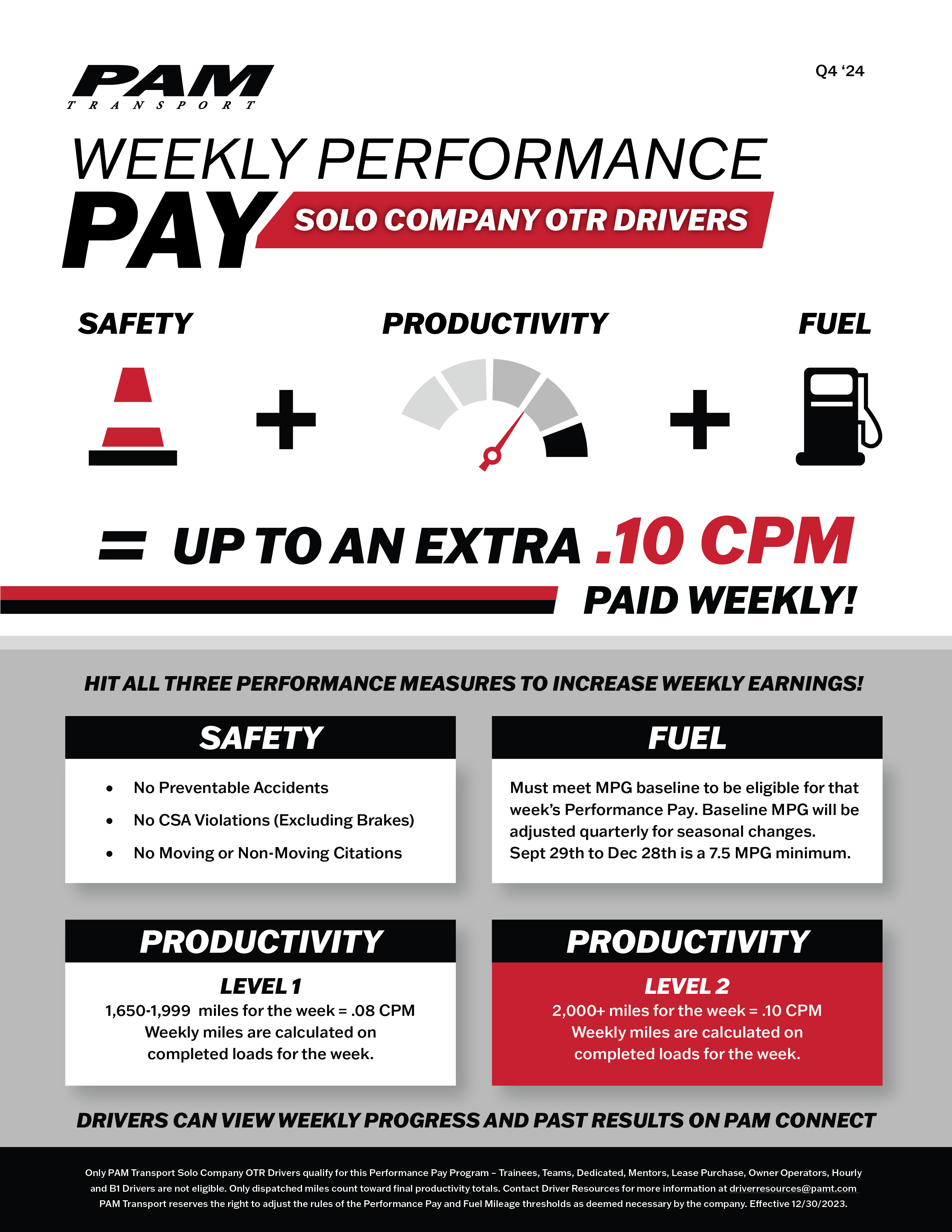 | Safety Bonus | Solo OTR Drivers who run at least 8,000 safe miles, have no preventable accidents, and have no CSA violations will earn a $750 bonus for the month. OTR Teams who run at least 18,000 safe miles, have no preventable accidents, and have no CSA violations will each earn a $1,000 bonus for the month. * Must be on the standard Company OTR solo/team pay scale (not a special rate, based on a particular customer). Performance Pay Pam now has new and improved performance pay, and it’s WEEKLY! Every driver will have a new chance at the additional pay every week! So if he/she has a bad week, for whatever reason, hope is not lost. This additional pay can add as much as $0.10 CPM to their rate. So it’s not only good for the driver but it’s good for your sell too! Miles per week drivers have to do to qualify: Level 1 1600 – 1999 miles per week Level 2 2000+ miles per week * Remember this is just for solo company drivers!!! * See the Performance Pay info in their info sheet |