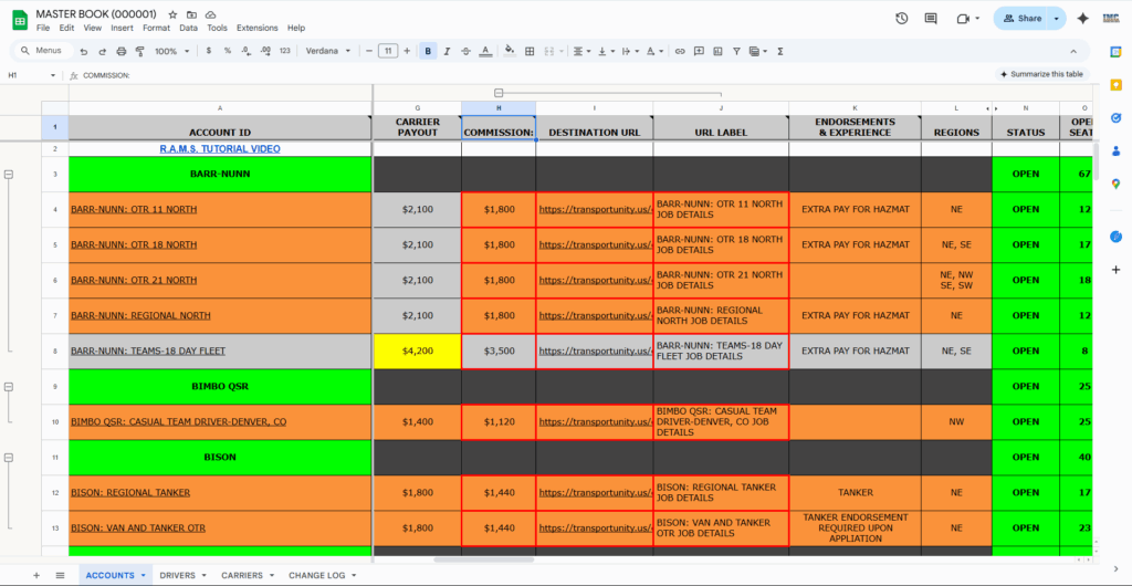 The TransporTunity+ and Ultimap plans both feature commission amounts within the R.A.M. System for each job. As the subscribing manager you’ll set the commission amounts and the URLs using the Master Book. It looks exactly like the Recruiter’s Book, except the Recruiters Book cannot be altered. It can, however, be searched and filtered in order to quickly find the information you need.
