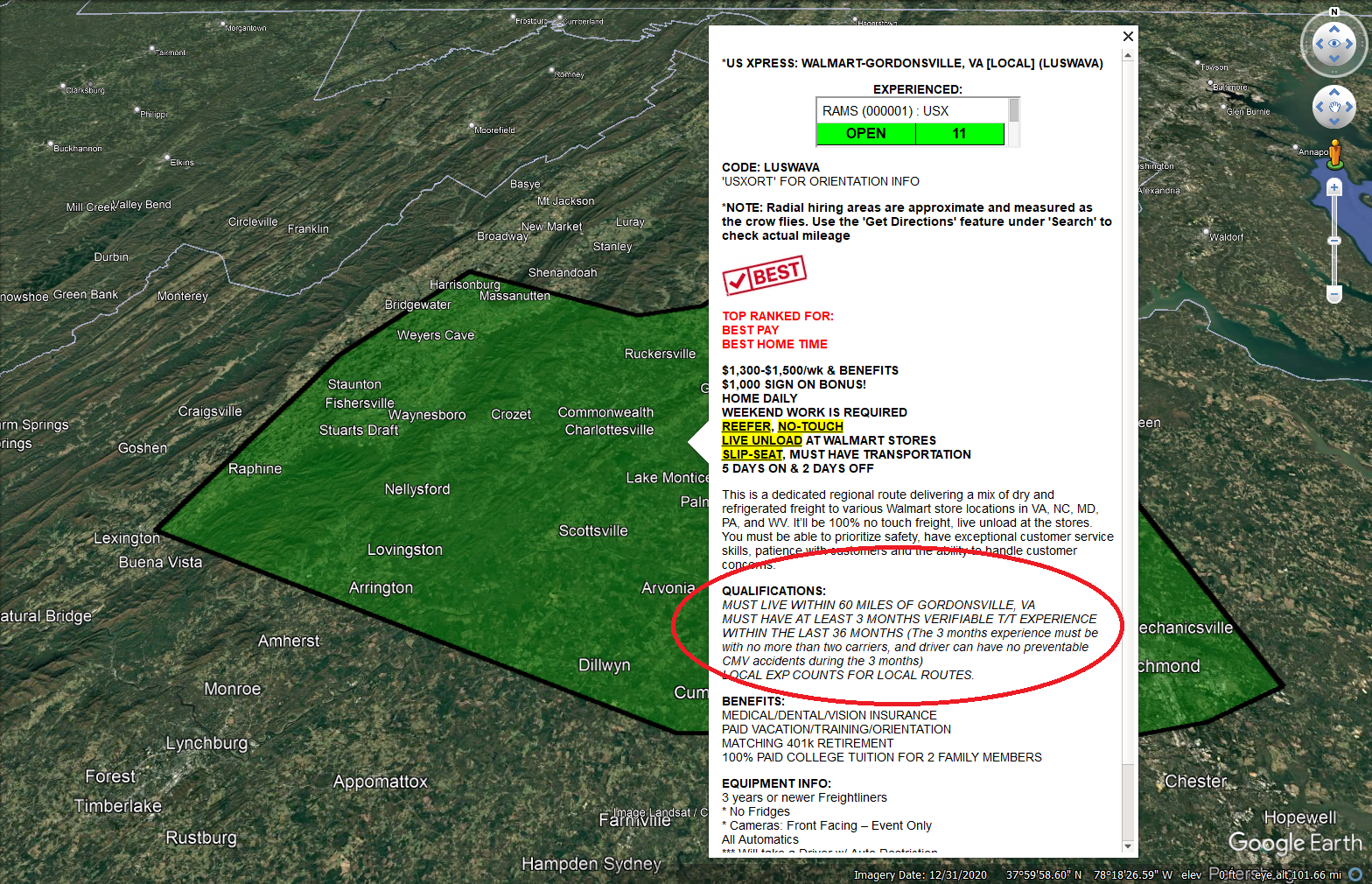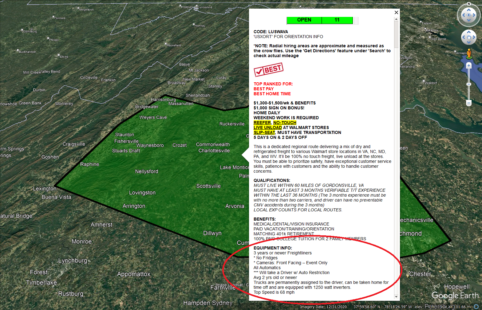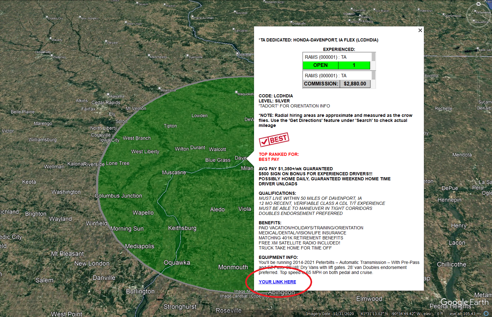 - Hiring areas – Only the hiring areas for open jobs will show up on the map. Once a job closes, the hiring area disappears until more seats open up again. Hiring areas are automatically updated to reflect current carrier needs, and they’re COLOR CODED to correspond with job type: local, regional, and OTR.