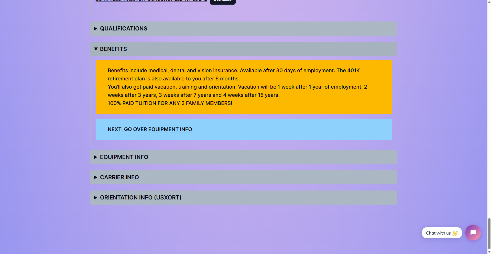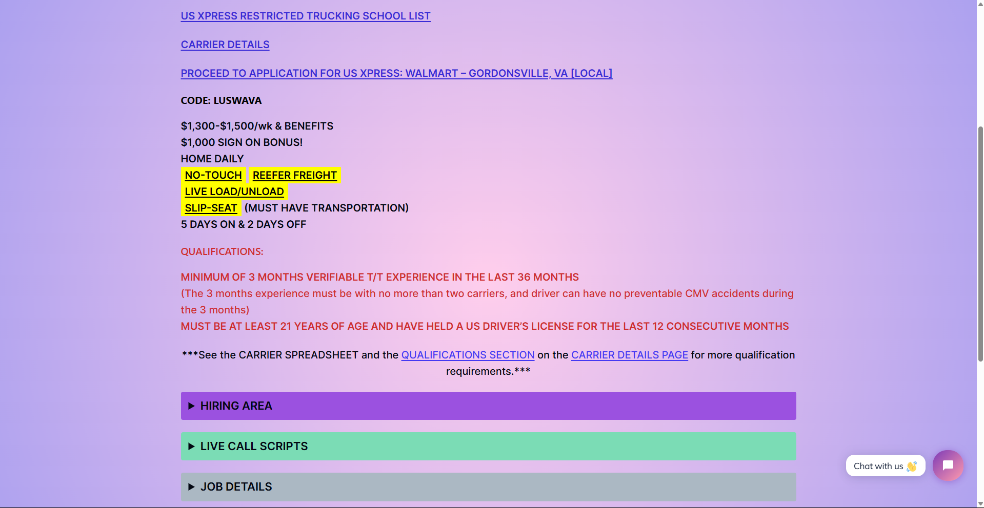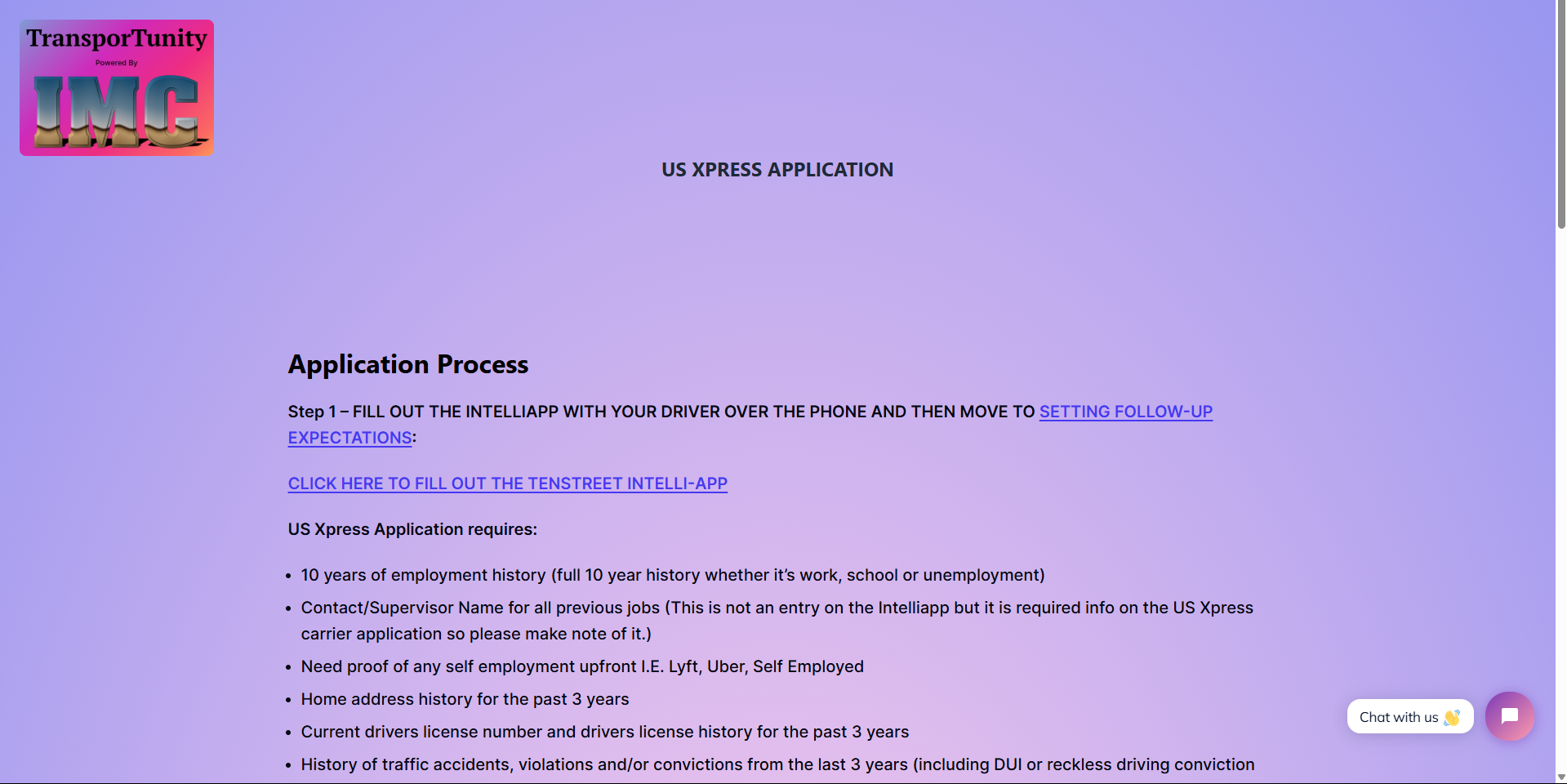 Application pages – A fully customizable page with your TenStreet intelli-app link that details all the information necessary to constitute a complete application for that carrier, as well as: