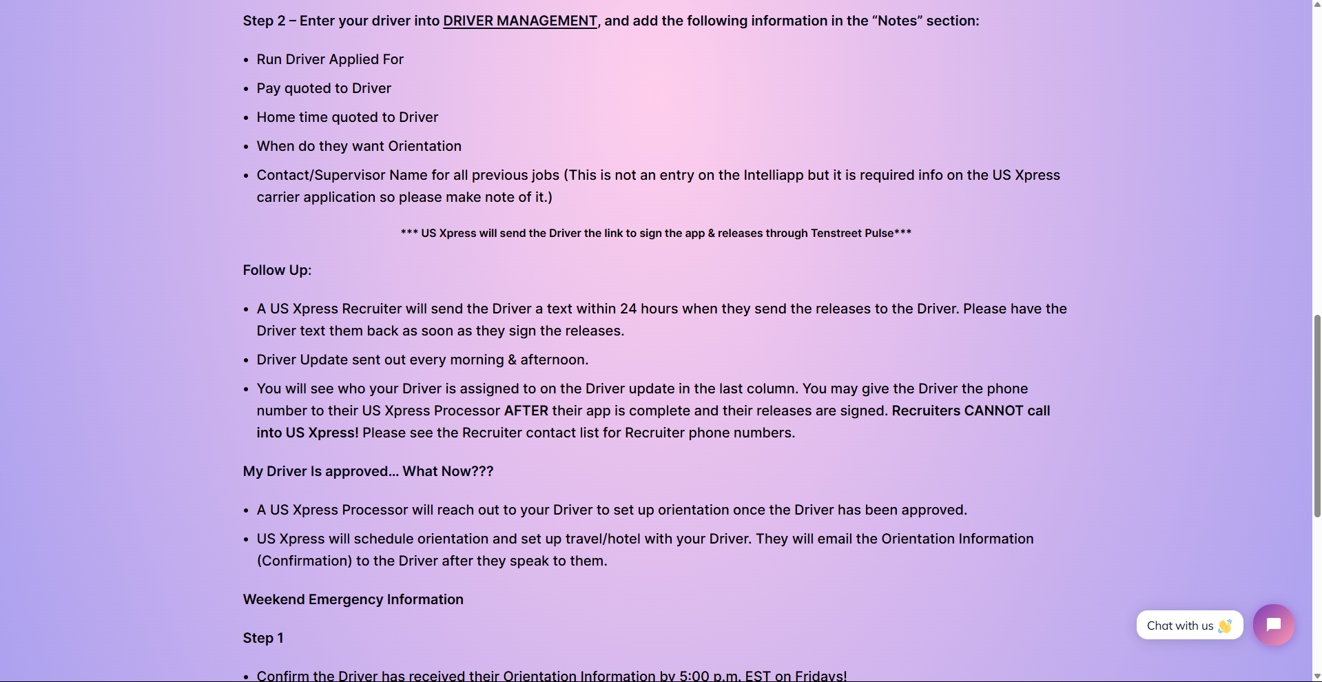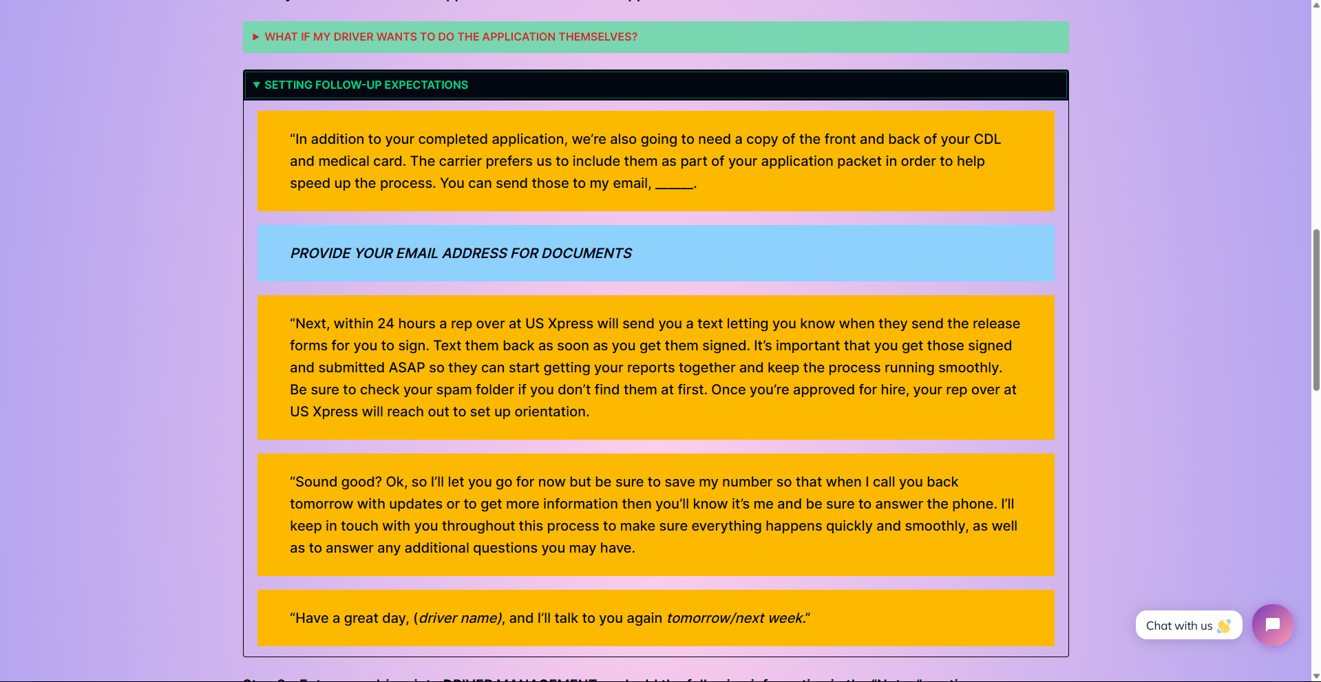 - Setting Driver Expectations area – customizable area that helps make sure the drivers know what to expect next with that carrier’s process and the follow-up until orientation.